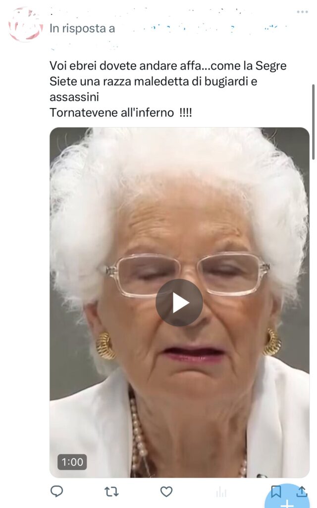 Utente X/Twitter posta un messaggio di odio contro Liliana Segre e gli ebrei: «Voi ebrei dovete andare affa…Come la Segre. Siete una razza maledetta di bugiardi e assassini. Tornatevene all’inferno !!!!».