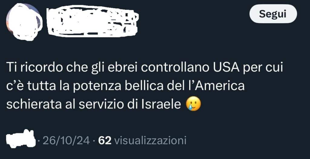 Utente X/Twitter pubblica un post dove scrive che «gli ebrei controllano gli Usa per cui c’è tutta la potenza bellica dell’America schierata al servizio di Israele».