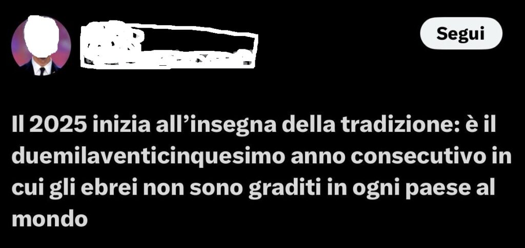 Utente X da tempo propagandista di antisemitismo online ed altre sgradevolezze avvolte in un becero pseudo-umorismo, posta un commento che recita: «Il 2025 inizia all’insegna della tradizione: è il duemilaventicinquesimo anno consecutivo in cui gli ebrei non sono graditi in ogni paese al mondo».