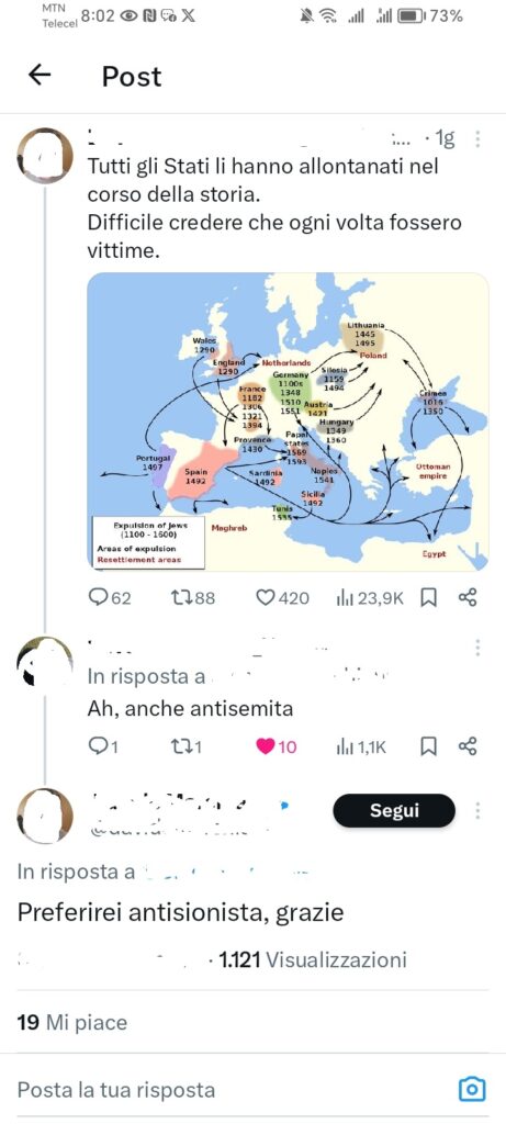 Stampa 16 Ottobre 2024 X/Twitter, post giustifica l’antisemitismo Fonte: Segnalazione «Preferirei antisionista, grazie» Utente X/Twitter pubblica un post che giustifica l’antisemitismo: «Tutti gli stati li hanno allontanati nel corso della storia. Difficile credere che ogni volta fossero vittime».