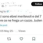 Account X neonazista posta volgari commenti di odio contro gli ebrei, spesso accompagnati dallo slogan “Juden Raus”: Noi odiamo gli ebrei…vorrei mandare via tutti gli ebrei dall’Italia…Non ci sono ebrei meritevoli.