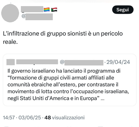 Stampa 3 Giugno 2025 X/Twitter, post sul pericolo delle “infiltrazioni sioniste” Luogo: X/Twitter Fonte: Segnalazione Post di un esponente della comunità LGBTQI+ su presunte infiltrazioni sioniste in Europa da parte di ebrei che lavorano per il governo di Israele.