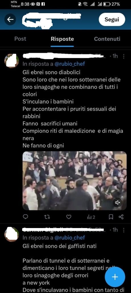 Stampa 15 Ottobre 2024 X/Twitter, sconcezze antisemite Fonte: Segnalazione «Gli ebrei sono diabolici…» Utente X/Twitter risponde ad un influencer antisemita scrivendo un commento contro gli ebrei intriso di sconce volgarità e di arcaici miti di accusa giudeofobici.
