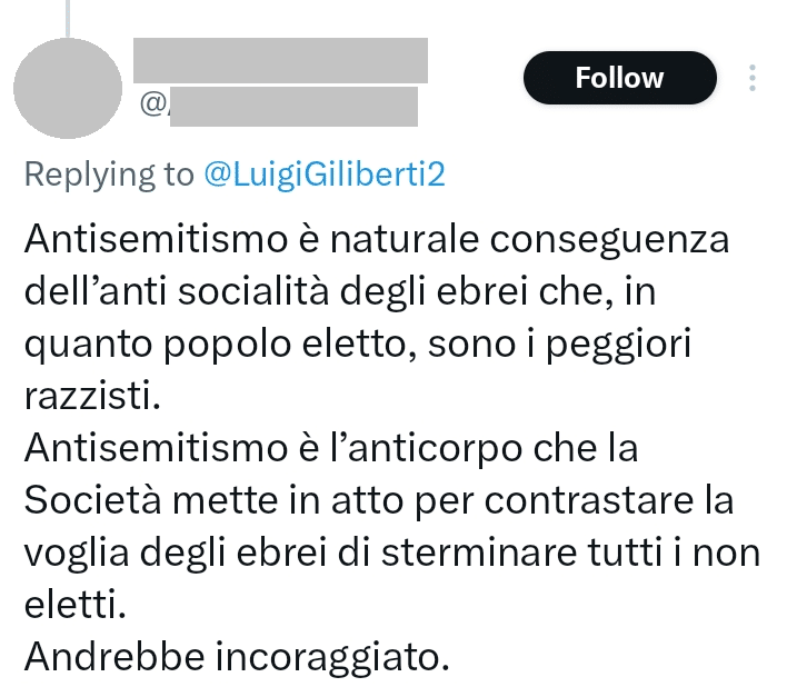 Un utente italiano sostiene su X che l’antisemitismo è la naturale conseguenza dell’antisocialità degli ebrei, che in quanto “popolo eletto”, sono i peggiori razzisti ed è un anticorpo della società per contrastare “la voglia degli ebrei di sterminare i non eletti” (accusa del sangue). Ergo l’antisemitismo andrebbe incoraggiato.