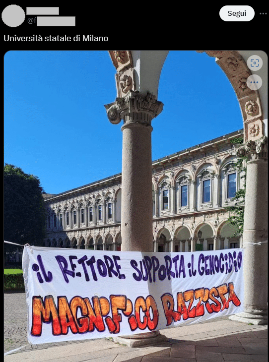 Stampa 23 Giugno 2024 X, utente pubblica striscione all’Università Statale Luogo: Milano Fonte: Segnalazione CE “Magnifico (Rettore) razzista” Post su X con immagine di uno striscione che accusa l’Università Statale di supportare il genocidio.