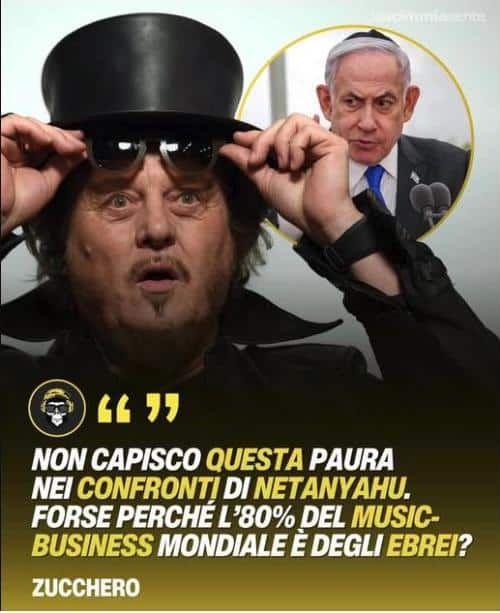 «L’80% del music business mondiale è in mano agli ebrei». Lo ha sostenuto Adelmo Fornaciari, in arte Zucchero, la settimana scorsa nel corso della conferenza stampa di presentazione del prossimo tour estivo che partirà a luglio in Italia, con una prima data zero a maggio a Mantova. Le dichiarazioni riprese da agenzie e testate nazionali sono state poi rilanciate da dozzine di profili online – sia su Instagram e Facebook (gruppo Meta) che su X. Zucchero ha citato il dato collegandolo a una presunta censura da parte degli artisti rispetto alle critiche al governo israeliano.