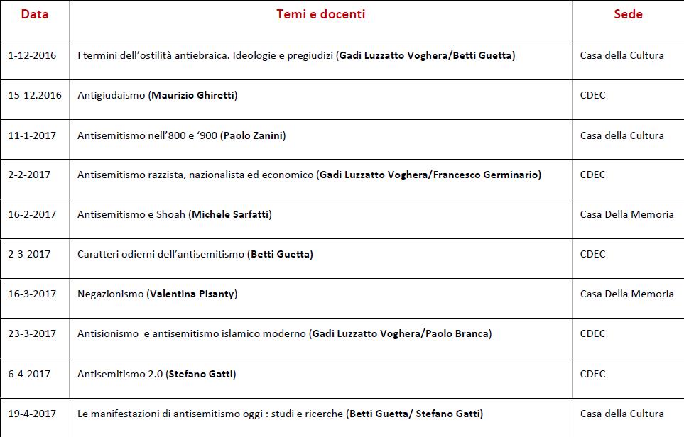 Il primo dicembre inizia un corso sull’antisemitismo rivolto alla cittadinanza, con il patrocinio di UCEI, CDEC, Casa della Cultura e Insmli. Il corso di taglio storico e sociologico si svolgerà in tre sedi: CDEC, Casa della cultura, Casa della Memoria con l’auspicio di radunare pubblici diversi e multiformi. Parleremo di antisemitismo ma anche di razzismo e di pregiudizio. Per evidenziare quali elementi l’antisemitismo condivide con l’etnocentrismo o il razzismo e quali siano i suoi caratteri specifici.