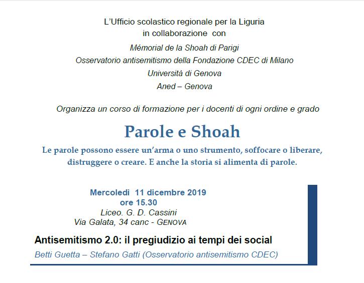 L’intervento sull’evoluzione dell’antisemitismo nei moderni mezzi di comunicazione è a cura di Betti Guetta, Responsabile Osservatorio Antisemitismo della Fondazione CDEC, ed è promosso dall’Ufficio Scolastico Regionale Liguria all’interno del corso di formazione per docenti “Parole e Shoah”.