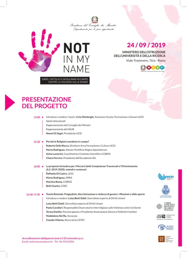 È la sfida del progetto “Not in my name. Ebrei, Cattolici e Musulmani in campo contro la violenza sulle Donne”, frutto della collaborazione tra l’Unione delle Comunità Ebraiche Italiane, la Comunità Religiosa Islamica Italiana e l’Ateneo Pontificio Regina Apostolorum sotto l’egida del Dipartimento per le Pari Opportunità della Presidenza del Consiglio dei Ministri che ne ha finanziato la realizzazione.