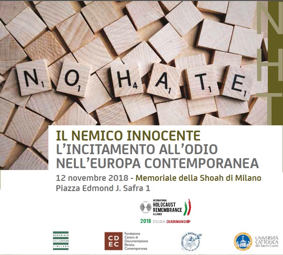 In occasione della presidenza italiana dell’International Holocaust Remembrance Alliance, il 12 novembre 2018 il Memoriale della Shoah di Milano, la Fondazione Centro di Documentazione Ebraica Contemporanea CDEC Onlus, l’Associazione figli della Shoah e l’Università Cattolica del Sacro Cuore organizzano la conferenza “Il nemico innocente l’incitamento all’odio nell’Europa contemporanea” presso il Memoriale della Shoah di Milano, in piazza Edmond J. Safra 1.