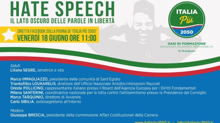 Non si fermano i fenomeni di odio, intolleranza, razzismo contro singoli e intere comunità, anche sul web. Per sollecitare l’attenzione delle istituzioni e dell’opinione pubblica su questo tema Italia Più 2050, l’associazione culturale apolitica animata da esponenti politici e della società civile, promuove per il prossimo venerdì 18 giugno alle ore 11 l’evento “Hate speech. Il lato oscuro delle parole in libertà”.