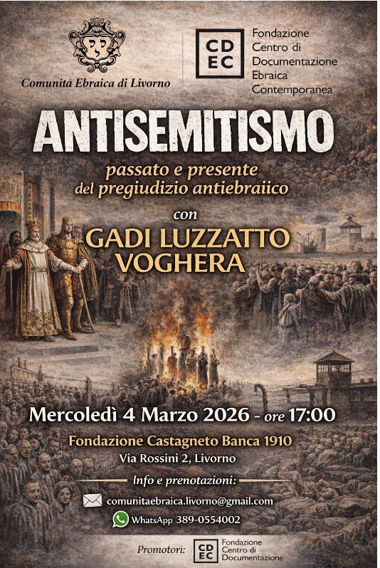 Stampa 4 Marzo 2026 Livorno, conferenza sull’antisemitismo con Gadi Luzzatto Voghera, direttore della Fondazione CDEC Luogo: Fondazione Castagneto Banca 1910, via Rossini 2, Livorno ANTISEMITISMO passato e presente del pregiudizio antiebraico con Gadi Luzzatto Voghera Fondazione Castagneto Banca 1910, via Rossini 2, Livorno Mercoledì 4 marzo 2026 – ore 17:00