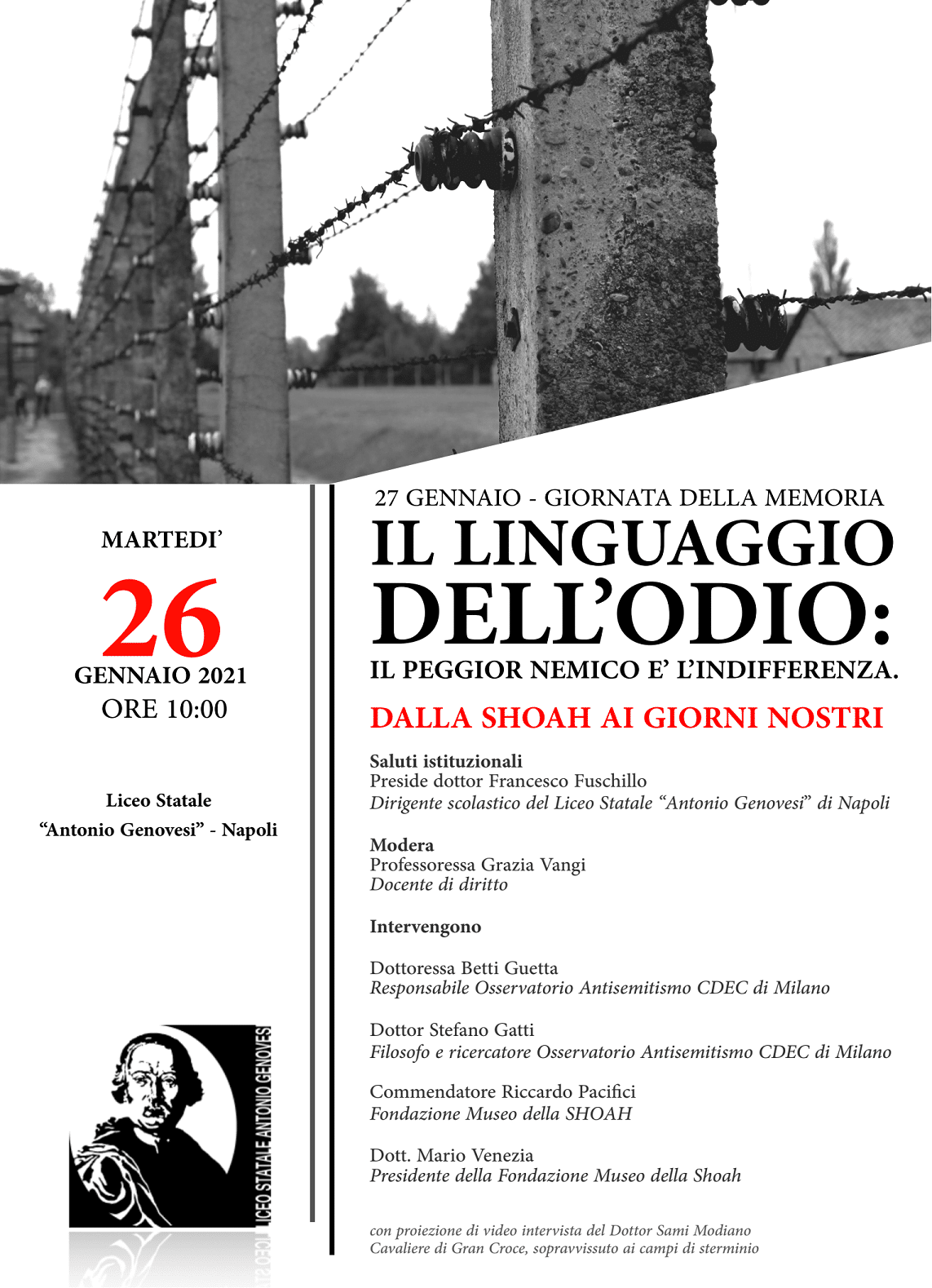 Martedi 26 gennaio, dalle 10.00 alle 12.00 si svolgerà il videoconvegno “Il linguaggio dell’odio: il peggior nemico è l’indifferenza” promosso dal liceo statale “Antonio Genovesi” di Napoli.