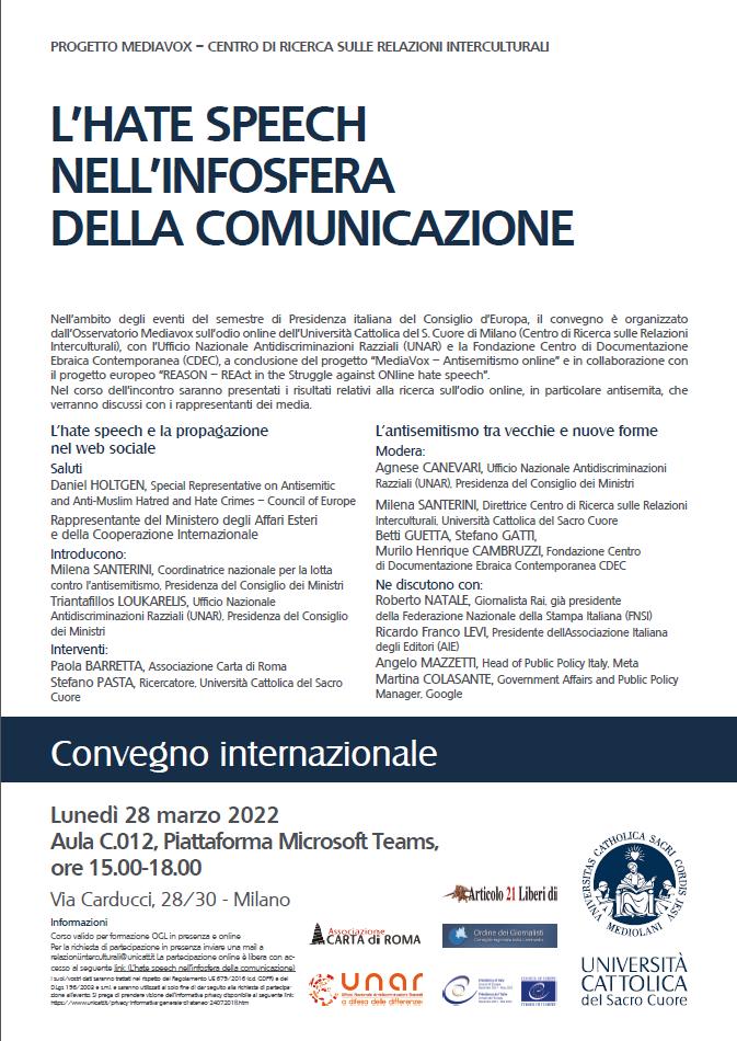 Per approfondire il tema lunedì 28 marzo si svolgerà in Università Cattolica (aula C012 via Carducci 28/30 a Milano e online alle ore 15) il convegno internazionale “L’hate speech nell’infosfera della comunicazione”, promosso dall’Osservatorio Mediavox sull’odio online dell’Ateneo di largo Gemelli (Centro di Ricerca sulle Relazioni Interculturali), insieme all’Ufficio Nazionale Antidiscriminazioni Razziali (UNAR) e all’Osservatorio Antisemitismo del Centro di Documentazione Ebraica Contemporanea (CDEC). L’evento, a conclusione del progetto “MediaVox – Antisemitismo online”, è in collaborazione anche con il progetto europeo “REASON – REAct in the Struggle against ONline hate speech”.