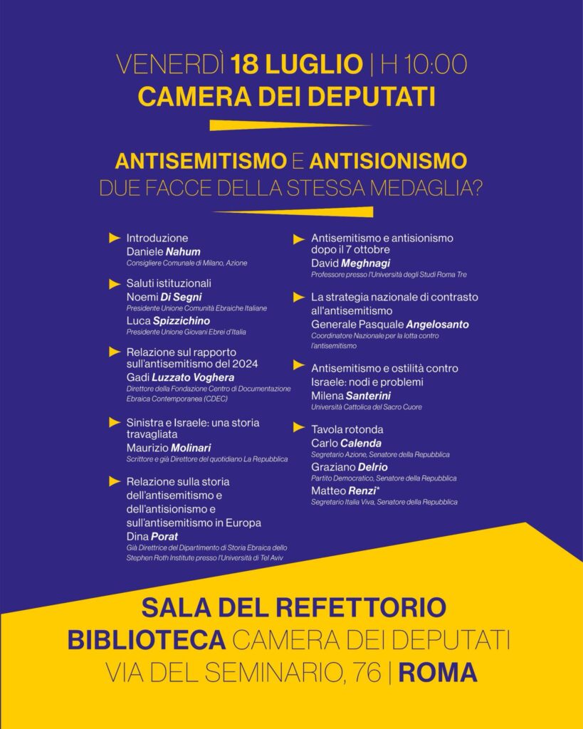 Il 18 luglio, alle ore 10:00, presso la Camera dei Deputati (Sala del Refettorio Biblioteca, Via del Seminario, 76, Roma), Azione organizzerà un importante convegno dal titolo: “Antisemitismo e antisionismo: due facce della stessa medaglia?”.