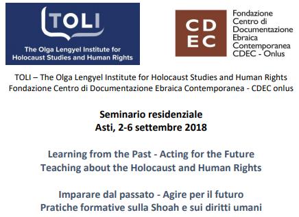 A 80 anni della promulgazione dei provvedimenti antiebraici in Italia, TOLI e Fondazione CDEC organizzano un seminario residenziale della durata di 5 giorni rivolto a 35 docenti delle scuole secondarie di secondo grado di tutto il territorio nazionale, in merito alle pratiche formative sulla Shoah e sui diritti umani. L’offerta seminariale coniuga temi del dibattito storico del Novecento, dall’antisemitismo in Italia in età contemporanea alla legislazione antiebraica fascista, all’analisi delle cause e degli effetti dell’odierno discorso d’odio, al fine di offrire ai partecipanti strumenti idonei per lavorare con i propri studenti secondo i programmi curriculari, gli obiettivi dell’educazione alla cittadinanza, gli intenti del Giorno della Memoria, oltrepassando la mera commemorazione e finalizzando la pratica formativa ad una salda conoscenza degli eventi storici, all’impegno in tema di giustizia sociale e all’acquisizione di alcune delle competenze chiave per l’apprendimento permanente. Il programma abbina approcci educativi e metodologie didattiche transnazionali, lungo un percorso che muove dall’apprendimento formale ed esperienziale, centrato sui discenti, per giungere alla stesura di un piano d’azione da parte dei corsisti. La sede scelta, Asti, sarà il fulcro di un itinerario alla scoperta di alcuni dei siti più significativi dell’ebraismo piemontese: Saluzzo, Cherasco, Carmagnola e Torino.