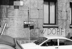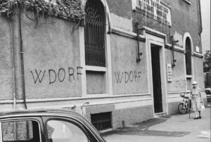 “W Dorf”, graffitti in riferimento a Erik Dorf, personaggio della serie Olocausto (1978), un SS, diventando simbolo degli esecutori della Shoah.