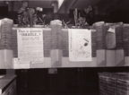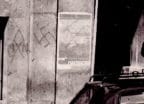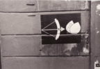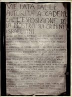 Il disegno rappresenta un arco ed una freccia con una punta a stella di Davide che colpisce la colomba della pace Festa del Perdono, angolo piazzetta Santo Stefano, Milano Aprile 1973