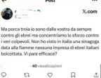 «Non ho visto in Italia una sinagoga data alle fiamme nessuna impresa di ebrei italiani boicottata.» Utente X posta il seguente messaggio minaccioso: «Ma porca troia io sono dalla vostra da sempre contro gli ebrei ma concentriamo lo sforzo contro … Leggi tutto