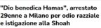 “Dio benedica Hamas”, arrestato 29enne a Milano per odio razziale e istigazione alla Shoah L’uomo aveva diffuso online esternazioni antisemite all’indomani del 7 ottobre e manifestato l’intenzione di intraprendere il jihad. Quattro perquisizioni nei confronti di persone che avevano sostenuto …