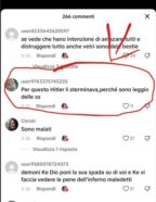 «aveva ragione Adolfo» Utente Instagram posta un commento antisemita dove accusa gli ebrei di essere “assassini dalla nascita, assassini di profeti” e che “Adolfo [Hitler, ndr] aveva ragione”.