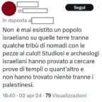 Utente su X, con un linguaggio volgare, sostiene che non vi siano prove archeologiche a fondamento delle radici giudaiche di Israele. Secondo lui gli archeologi hanno provato a cercare “prove di templi o quant’altro”, e non avrebbero trovato nulla.