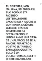 «tu sei ebrea, non italiana…» Donna ebrea viene pesantemente attaccata su un social, alcuni internauti la insultano in modo greve e violento: «vergognati, sei ebrea non italiana, ipocriti, false vittime, nazisti e carnefici, schifo, il popolo ebraico fa cacare, popolo … Leggi tutto