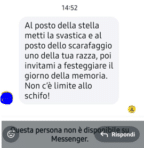 Una donna prende di mira una persona ebrea scrivendogli in privato. “Al posto della stella metti la svastica e al posto dello scarafaggio uno della tua razza […] Non c’è limite allo schifo!”