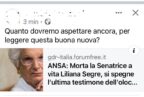 «Quanto dovremo aspettare ancora…» Utente Facebook condivide una notizia falsa sulla dipartita della senatrice Segre e la commenta con un augurio di morte alla signora..