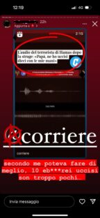 “10 ebrei son troppo pochi…” Un utente pubblica una story su Instragram commentando l’audio di un terrorista di Hamas che sostiene di aver ucciso dieci ebrei con le sue mani: “secondo me poteva fare di meglio, 10 ebrei son troppo …