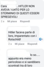 «Hitler non aveva torto per lo sterminio di questi esseri spregevoli» Due utenti Facebook, di simpatie ‘grilline’ e focalizzati sulle teorie cospirative (ad esempio le “scie chimiche”) indulgono anche nell’antisemitismo, qui di seguito una loro emblematica discussione: «Hitler non aveva … Leggi tutto