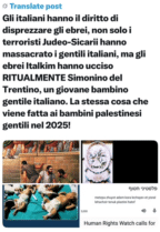 “Gli italiani hanno il diritto di disprezzare gli ebrei” Utente accusa gli ebrei di commettere omicidio rituale ancora oggi.