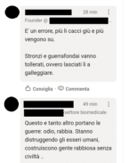 “più li cacci giù e più vengono su. Stronzi e guerrafondai vanno tollerati ovvero lasciati li a galleggiare” Così un utente italiano commenta la notizia dei turisti israeliani cacciati da un ristorante, paragonandoli a feci.